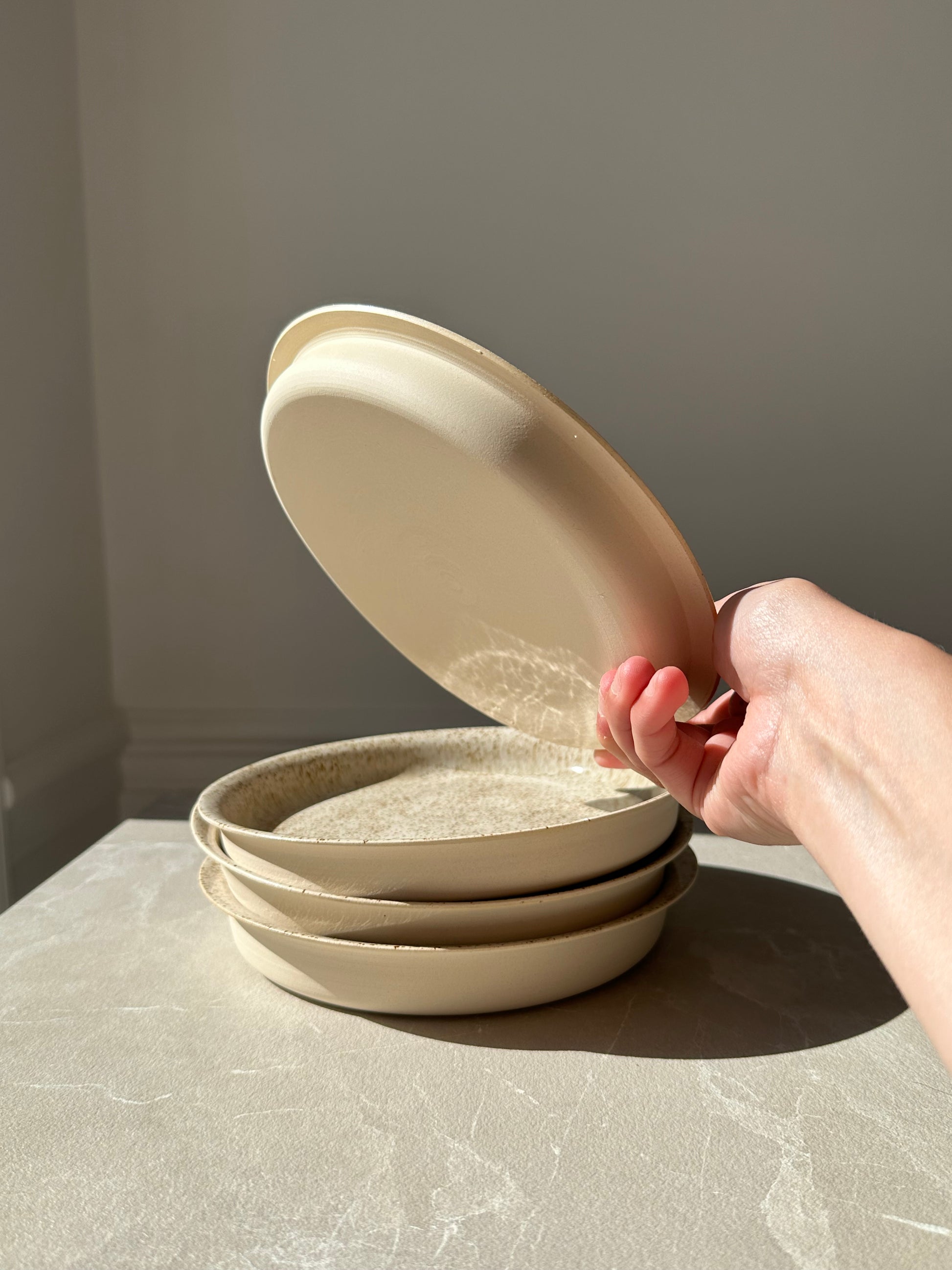 Chaque pièce est façonnée à la main en grès, puis émaillée avec soin pour révéler un jeu de textures et de couleurs, inspirés d’un voyage dans les Pouilles, en Italie — Les émaux mouchetés évoquent les murs patinés par le temps, les céramiques anciennes et la chaleur du sud.