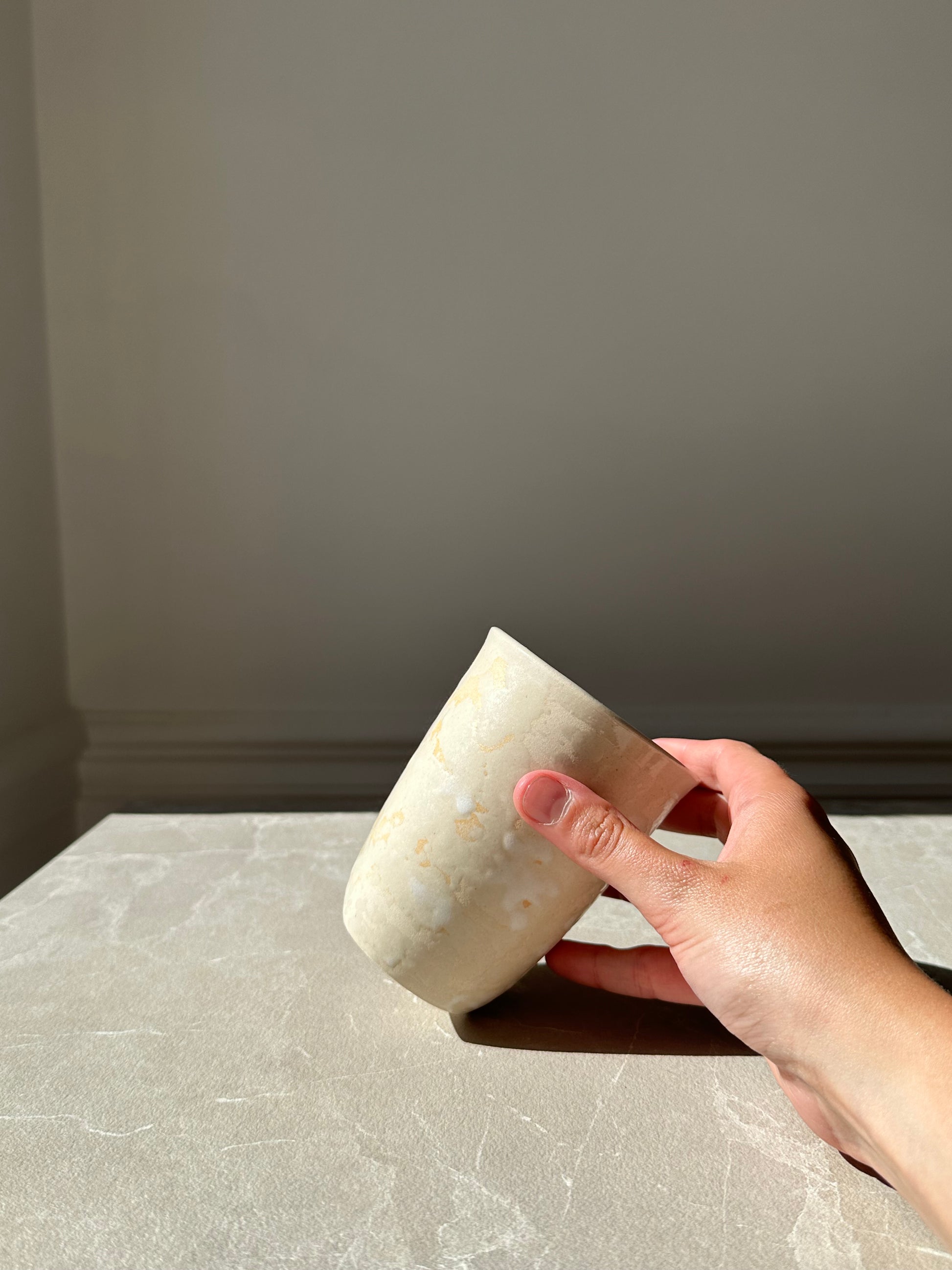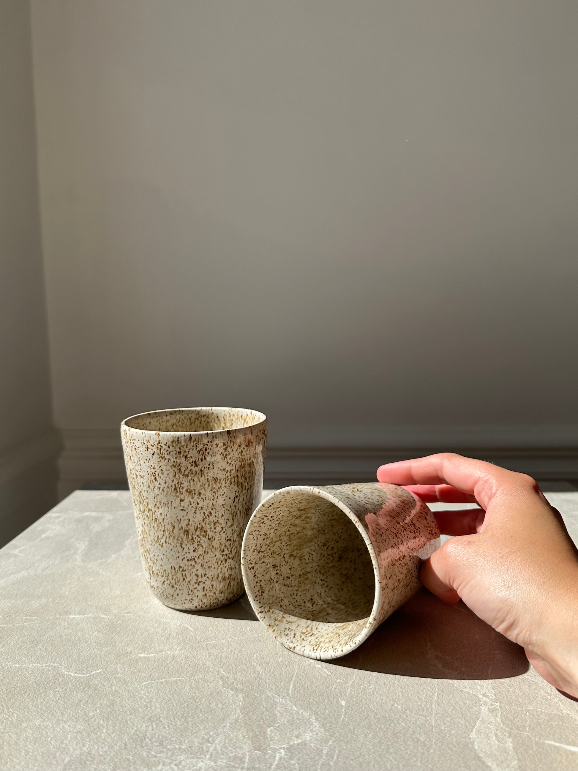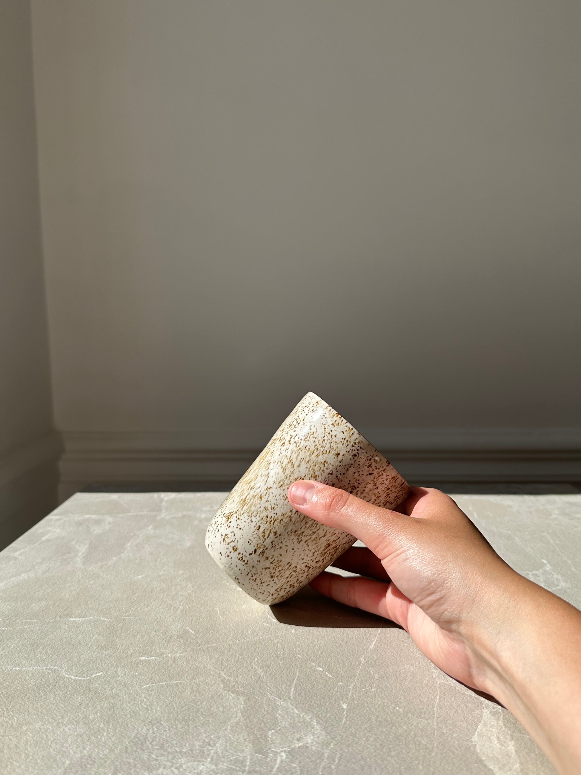 Chaque pièce est façonnée à la main en grès, puis émaillée avec soin pour révéler un jeu de textures et de couleurs, inspirés d’un voyage dans les Pouilles, en Italie — Les émaux mouchetés évoquent les murs patinés par le temps, les céramiques anciennes et la chaleur du sud.